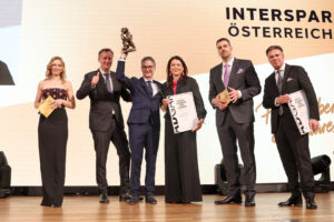 Die begehrte Auszeichnung als „Printwerber des Jahres 2025“ sicherte sich Interspar Österreich. „Interspar Österreich gibt Print seit Jahren einen fixen Platz im Mediamix und setzt Zeitungen und Magazine konsequent ein, um qualifizierte Reichweite, Vertrauen und Orientierung zu schaffen. Dieses klare Bekenntnis zu Print macht Interspar Österreich zu einem höchst verdienten Printwerber des Jahres 2025“, so Helmut Schoba (VGN Medien Holding), VÖZ-Vorstandsmitglied und Vorsitzender des Boards Werbemarkt, in seiner Laudatio. Gemeinsam mit VÖZ-Geschäftsführer Gerald Grünberger überreichte Schoba die Trophäe an Michaela Blüml, Geschäftsführer-Stellvertreterin von Interspar Österreich, und Hans Jürgen Wimmer, Bereichsleiter Marketing und Werbung bei Interspar.